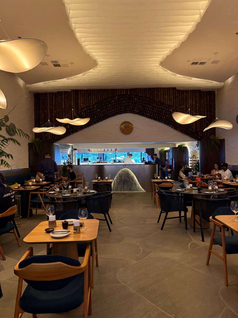 Desde a chegada — com serviço de valet — o ambiente já entrega uma proposta mais refinada: móveis bem selecionados, taças de cristal, louças bonitas e apresentações impecáveis.