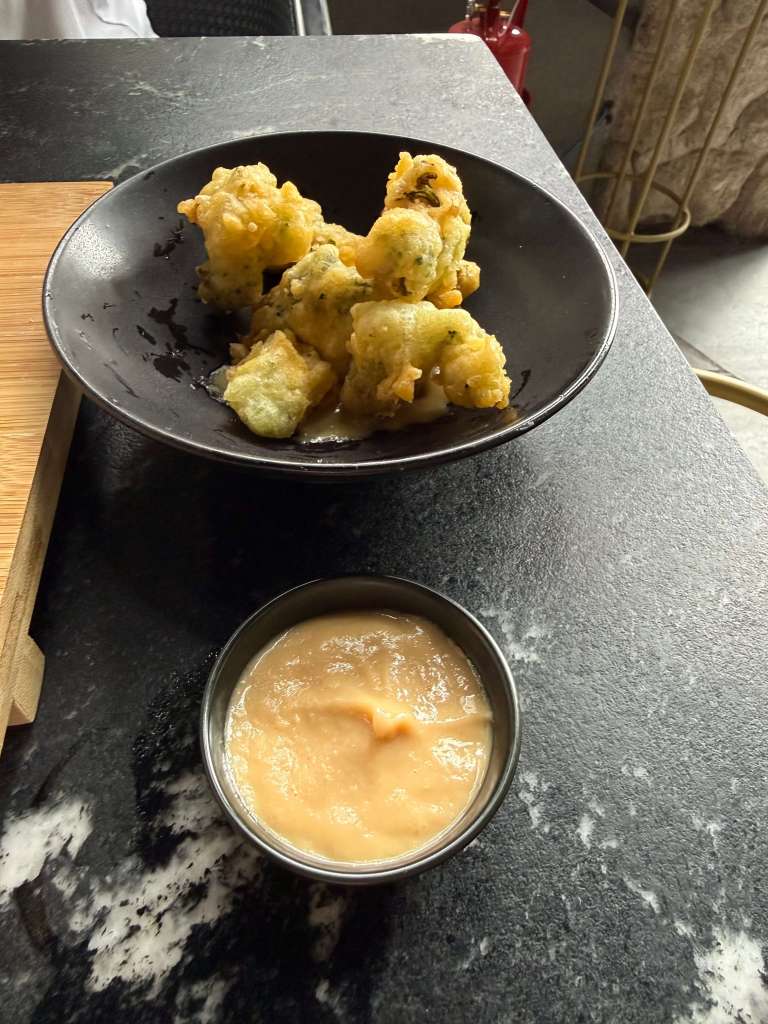 Também pedimos o brócolis tempurá (R$ 38). Aqui, o destaque absoluto foi o aioli de gergelim e mostarda — realmente incrível. Recomendo fortemente que você ignore qualquer tentativa de dieta e coma essa fritura generosamente mergulhada no molho, sem culpa. Vai valer a pena.