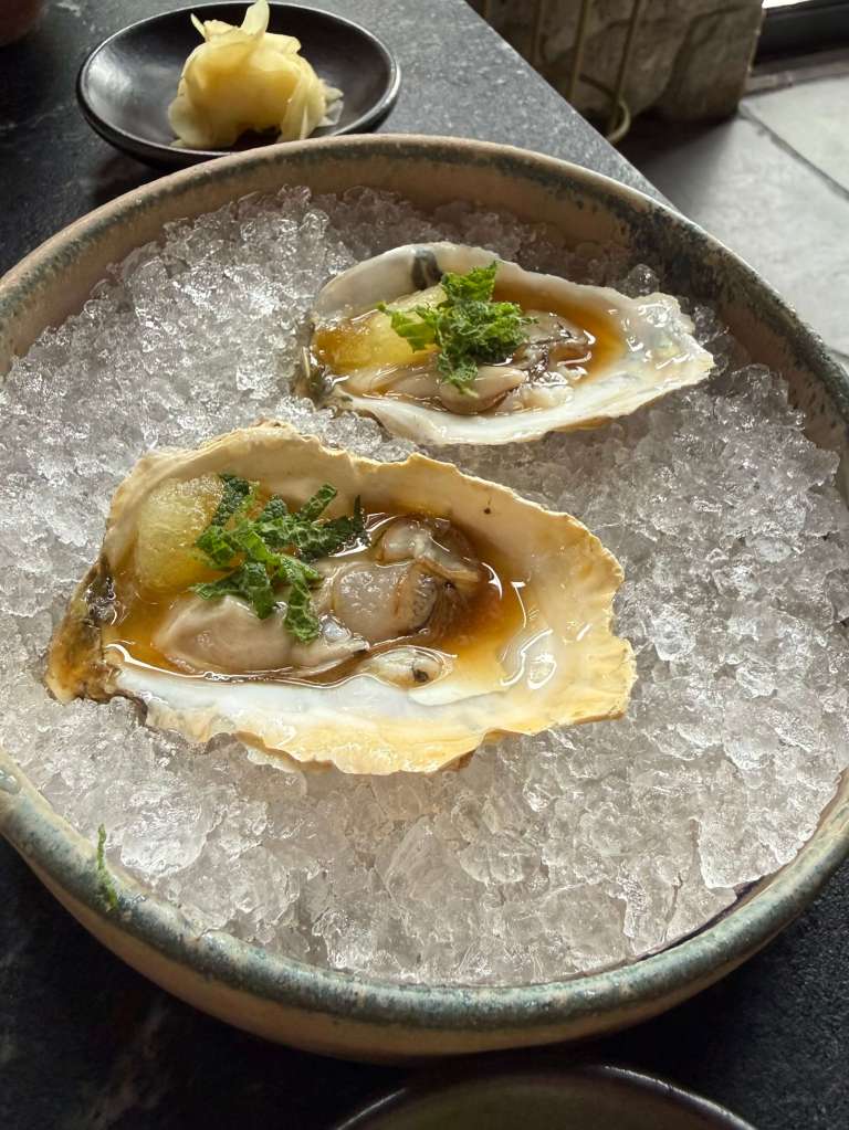 As ostras Midori (R$ 25) também me surpreenderam muito: ostra nativa com molho ponzu e um granité (tipo um sorbet) de maçã verde com hortelã. Delicioso e refrescante.